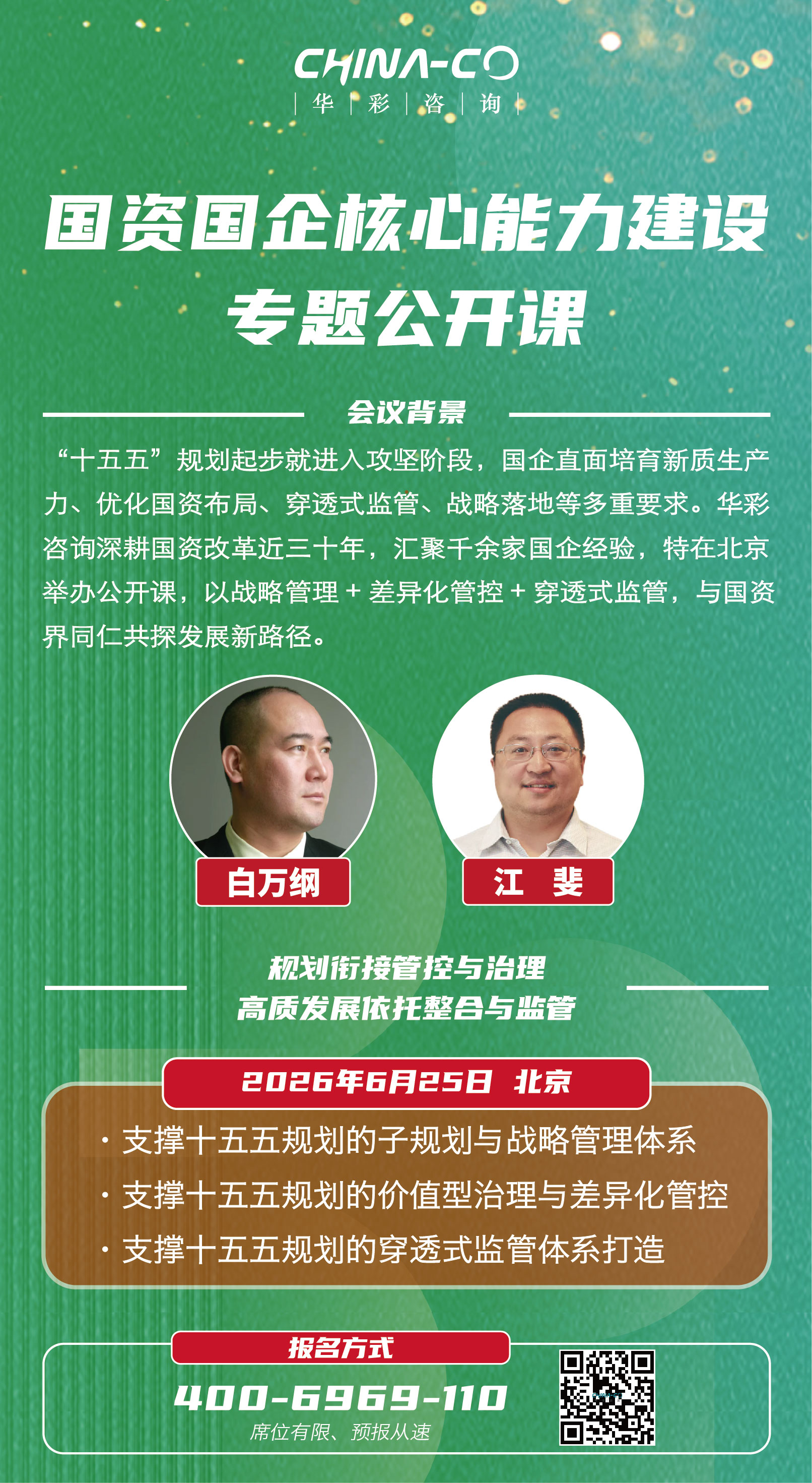 2025年8月6日,惠州国资国企 “十五五” 规划编制专题培训成功举办。华彩咨询集团总裁白万纲博士受邀担任主讲人,以 “十五五规划的规定动作与自选动作” 为核心主题,为惠州全市国资国企负责人带来一场兼具政策高度与实操价值的深度授课,助力地方国企精准把握规划编制核心逻辑,以高质量规划引领高质量发展。作为集团战略规划领域的资深专家,白万纲博士深耕国企咨询行业数十年,对国家战略导向、国企改革政策及规划编制方法论有着深刻洞察与丰富实践经验。培训中,他紧扣 “十五五” 时期国资国企发展的核心要求,围绕 “规定动作”